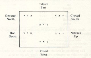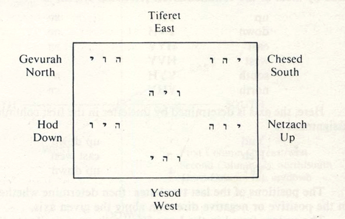 He selected three letters from the simple ones, and sealed them as forming his great Name, יהו and he sealed the universe in six directions. Five.- He looked above, and sealed the height, with יהו. Six.- He looked below, and sealed the deep, with יוה. Seven.- He looked forward, and sealed the East, with היו. Eight.-He looked backward, and sealed the West, with הוי. Nine.- He looked to the right, and sealed the South, with ויה. Ten.-He looked to the left, and sealed the North, with והי . These are the ten ineffable existences, the spirit of the living God, Air, Water, Fire, Height and Depth, East and West, North and South.