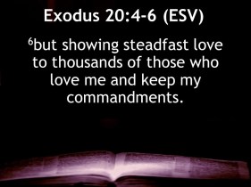 You do not make for yourself a graven image, nor any likeness of any thing that is in heaven above, or that which is in the earth beneath, or that which is in the water under the earth. You do not bow down to them, nor serve them, for I Yahweh your Elohim am a jealous El, visiting the iniquity of the fathers upon the children, upon the third and upon the fourth generation of them that hate me, but showing loving-kindness unto thousands of them that love me and keep my commandments (Exodus 20.-4-6).