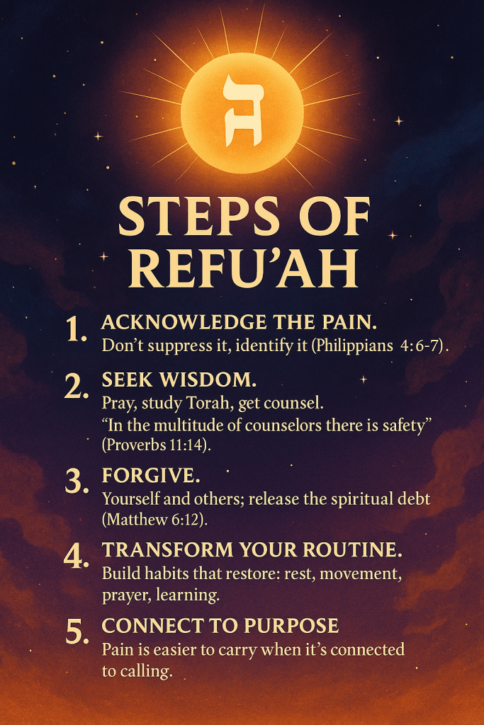 Teshuvah, or returning to our highest self through truth and accountability, softens the hardened places within us that pain often calcifies. Tefillah, the sincere and structured articulation of our needs and hopes, brings us into direct dialogue with YaH, creating space for supernatural comfort and guidance. And ta’anit, purposeful fasting, quiets the noise of the flesh so the soul’s voice can rise with clarity. These are not mere rituals, they are sacred technologies of transformation. Each of these practices helps transmute pain from a place of suffering into a wellspring of wisdom and compassion, reminding us that the pathway to healing is already encoded in the covenant we carry.