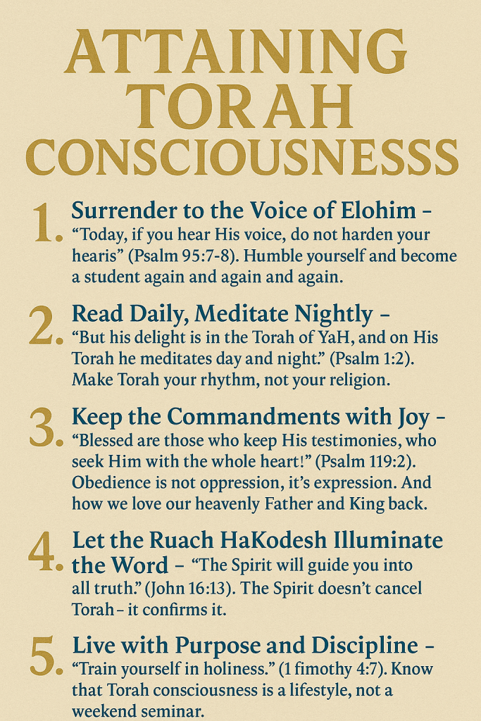 To be Torah conscious is to be Yah-conscious. It is to align every part of ourselves, heart, mind, soul, and strength, with the sacred pattern revealed from the beginning. It is not merely knowing the way, it is becoming the way.