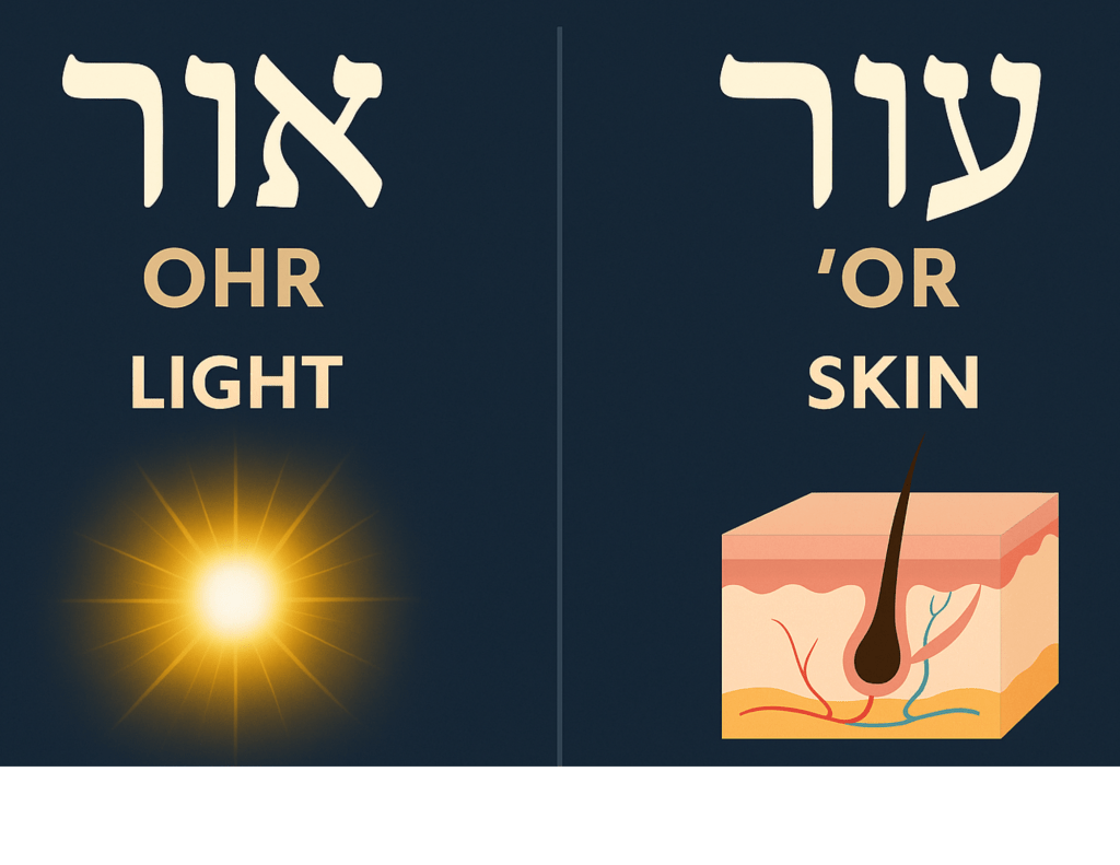 Before Adam and Chawah sinned, our sages say they were clothed in light (ohr – אוֹר), not skin (aur – עוֹר). This tradition comes from Bereishit Rabbah 20:12, which says, “Before the sin, they were clothed with garments of light; after the sin, garments of skin.” The difference between aleph (א) and ayin (ע) is subtle in sound but cosmic in meaning. Aleph represents the Divine breath and unity, ayin represents the eye, the perspective of sight and separation.