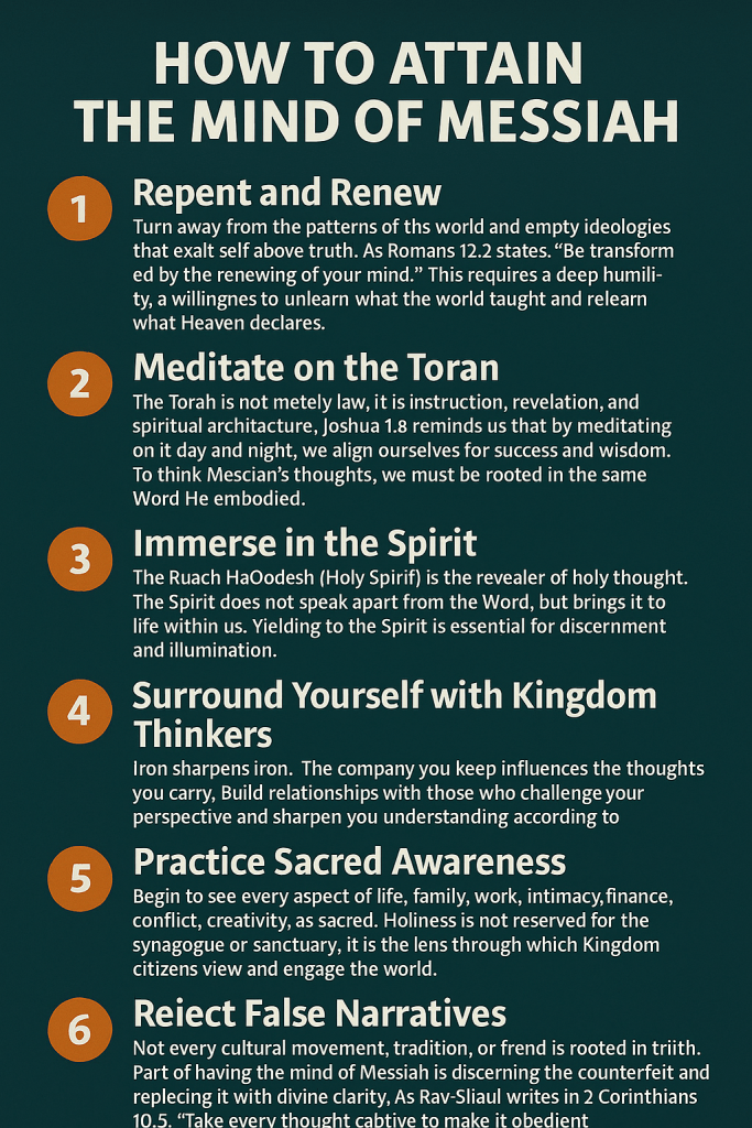 For us to attain the Mind of Messiah, we must engage in an intentional process of spiritual realignment. It does not happen by default, it is cultivated through pursuit, practice, and purification. Below are key steps to begin walking in this elevated consciousness: