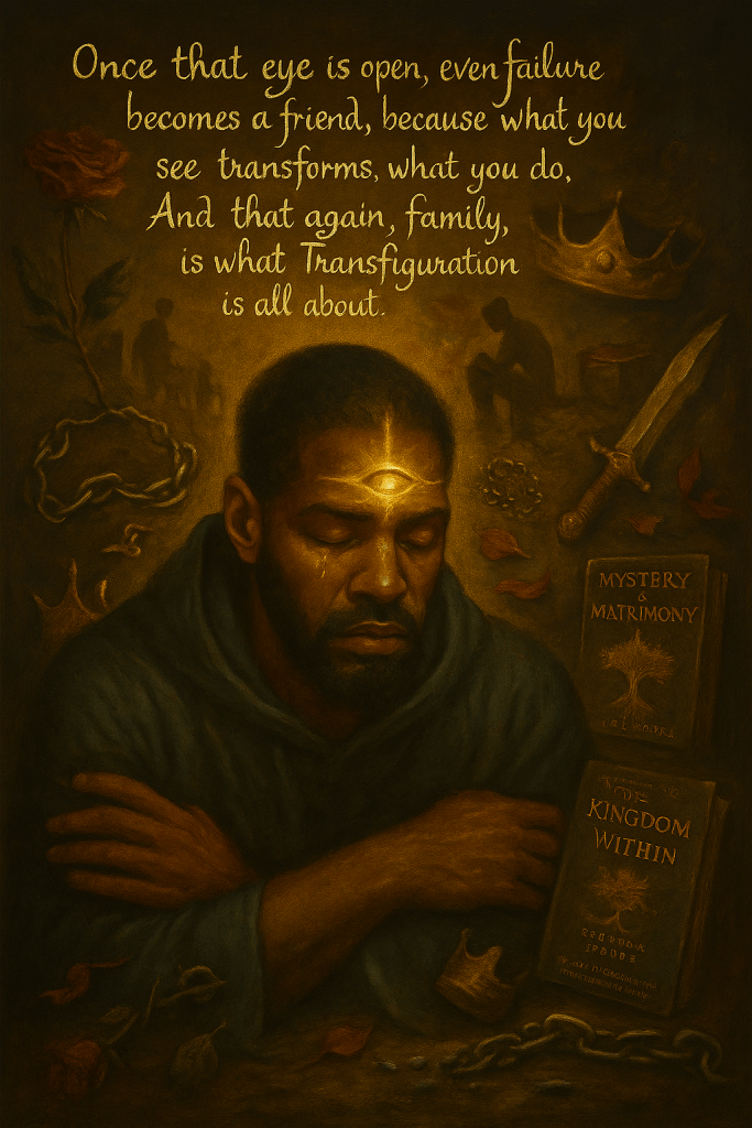 So, In my own journey, through broken relationships, failed ventures, injuries and betrayals, I can honestly say that it wasn’t the success that gave me my inner sight, it was the suffering. It was when I felt I had nothing left that I was finally able to really see. The eye that Job speaks of is the eye of mastery, the eye of clarity; it’s the eye that sees purpose in pain and holy presence even in the darkest darkness. And once that eye is open, even failure becomes a friend, because what you see transforms what you do. And that again, family, is what transfiguration is all about.