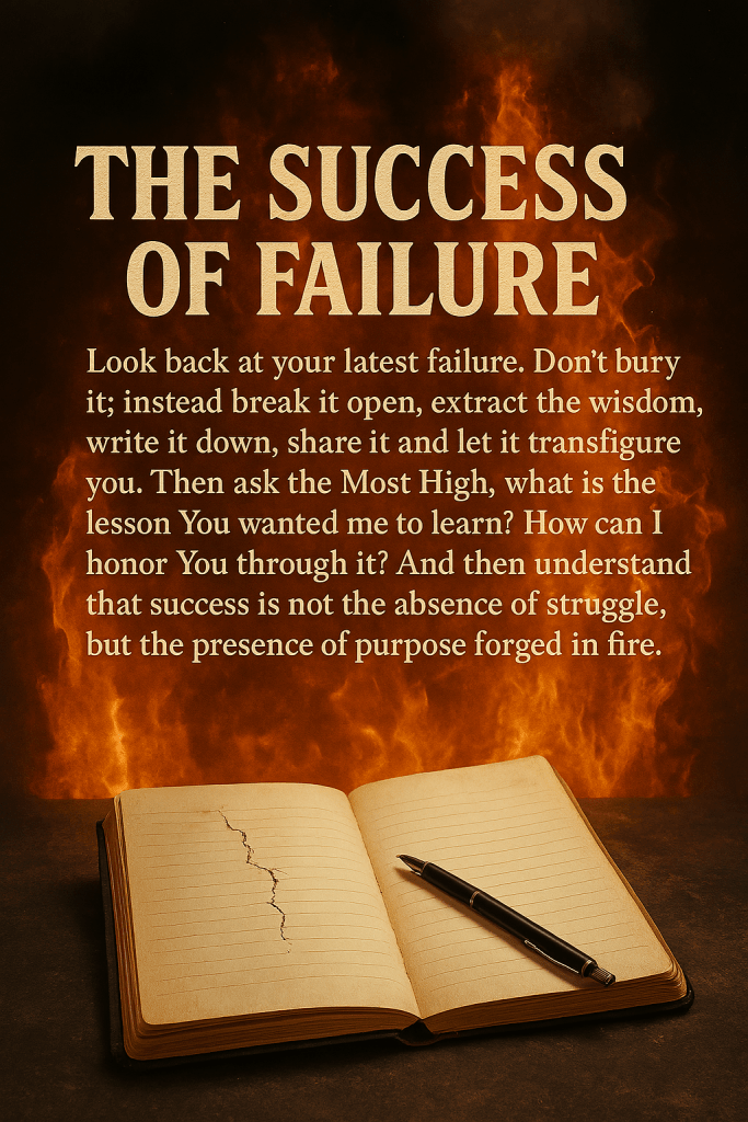 Look back at your latest failure. Don’t bury it, instead break it open, extract the wisdom, write it down, share it and let it transfigure you. Then ask the Most High, what is the lesson You wanted me to learn? How can I honor You through it? And then understand that success is not the absence of struggle, but the presence of purpose forged in fire.