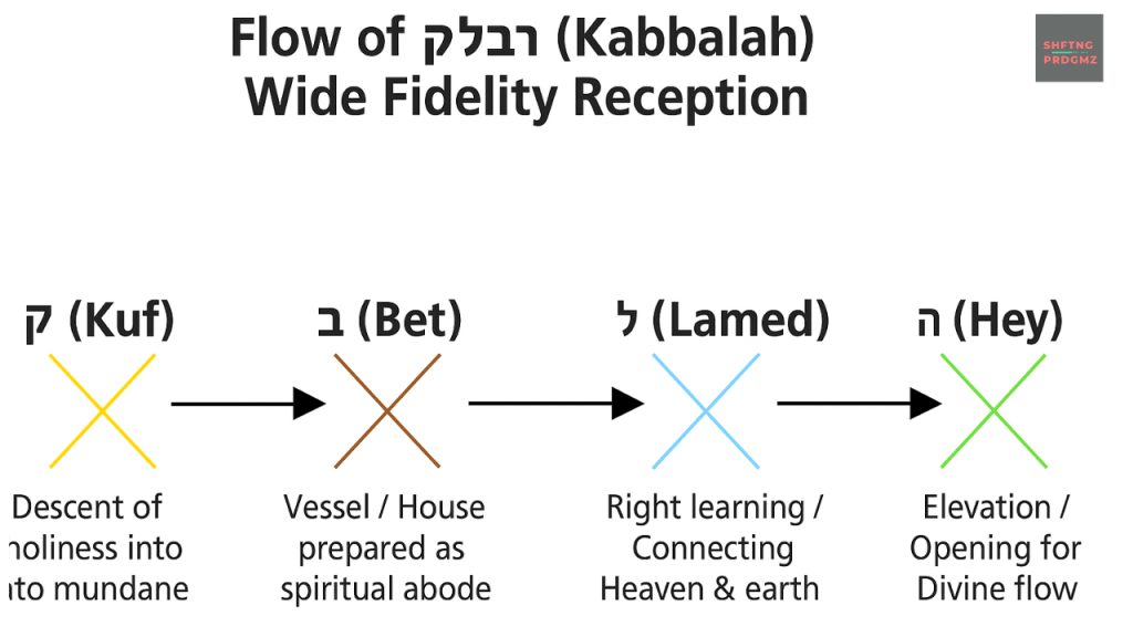 Taken together, Kabbalah means more than “to receive.” It is the entire circuitry of reception: the signal descending (ק), the vessel prepared (ב), the antenna reaching upward (ל), and the breath of revelation expanding outward (ה). This is Wireless Fidelity Reception on the spiritual plane. The Heavenly signal is always broadcasting; the question is whether our firmware (Torah), our compatibility (faith), and our bandwidth (devotion) are aligned to receive it with fidelity. When they are, the reception is not just personal but networked, we become transmitters of that light, creating a living covenantal web that spans generations.